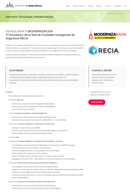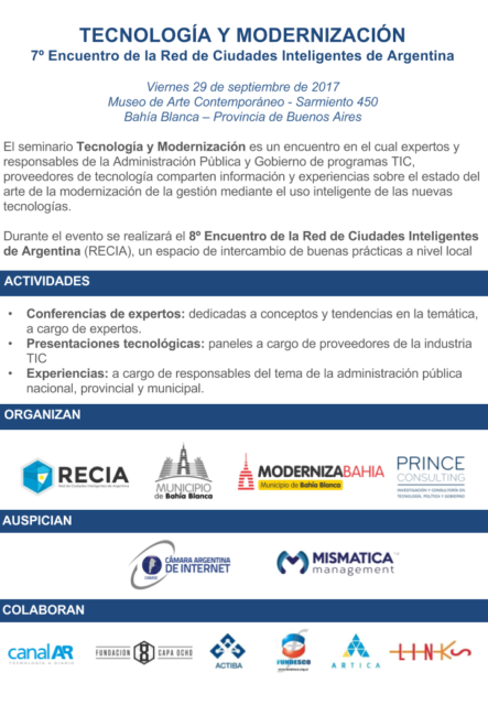 El 29 de Septiembre del 2017, tuvo lugar ayer el 7º Encuentro de la Red de Ciudades Inteligentes de Argentina (RECIA) en la Ciudad de Bahía Blanca, Provincia de Buenos Aires. La apertura estuvo a cargo de la titular de la cartera municipal del área, Elisa Quartucci, y de Lucas Jolías, director de RECIA.